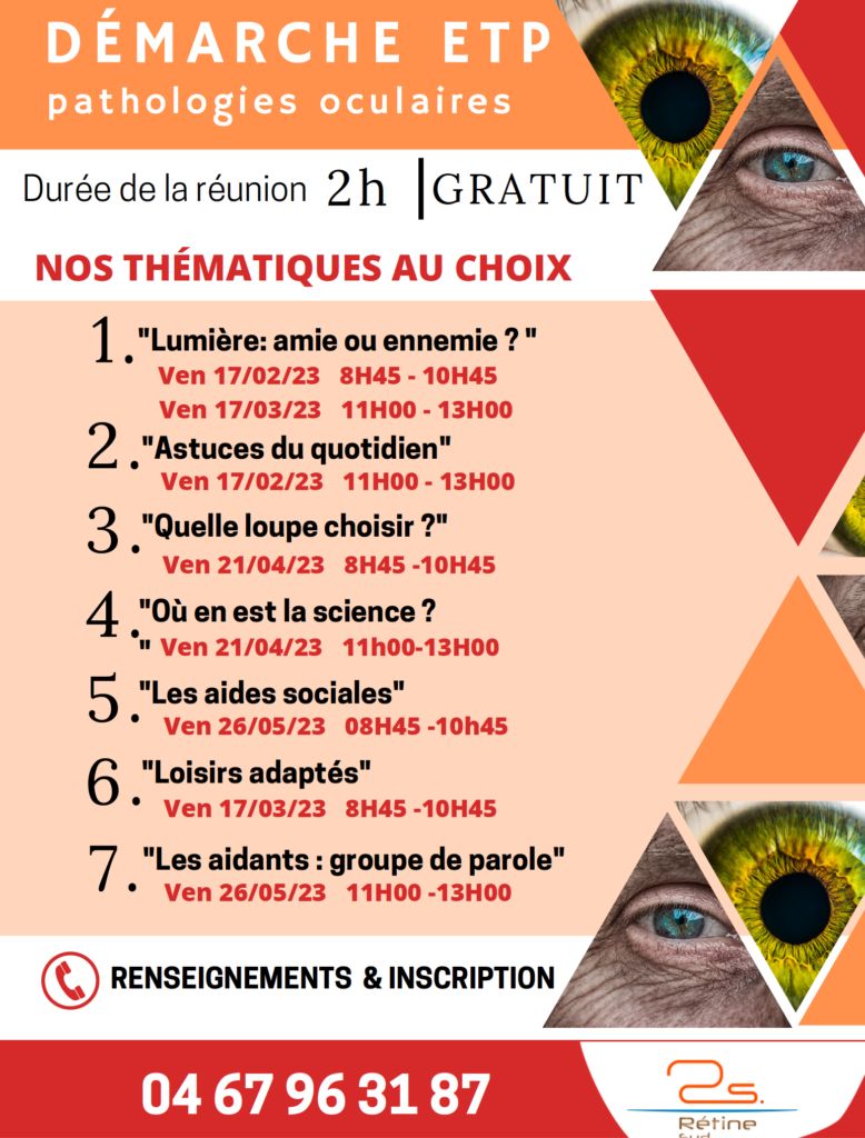 Ces ateliers, entièrement gratuits, ont lieu au Centre Rétine Sud, Pôle consultation de la clinique Saint Jean, 2 place de l’Europe 4ème étage à Saint Jean de Védas.
