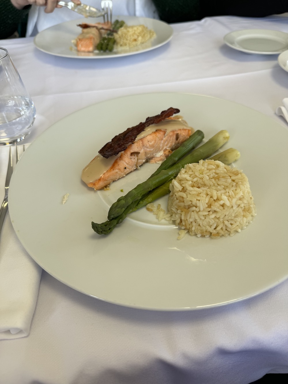 - saumon avec du riz , des asperges et une sauce aigre douce,